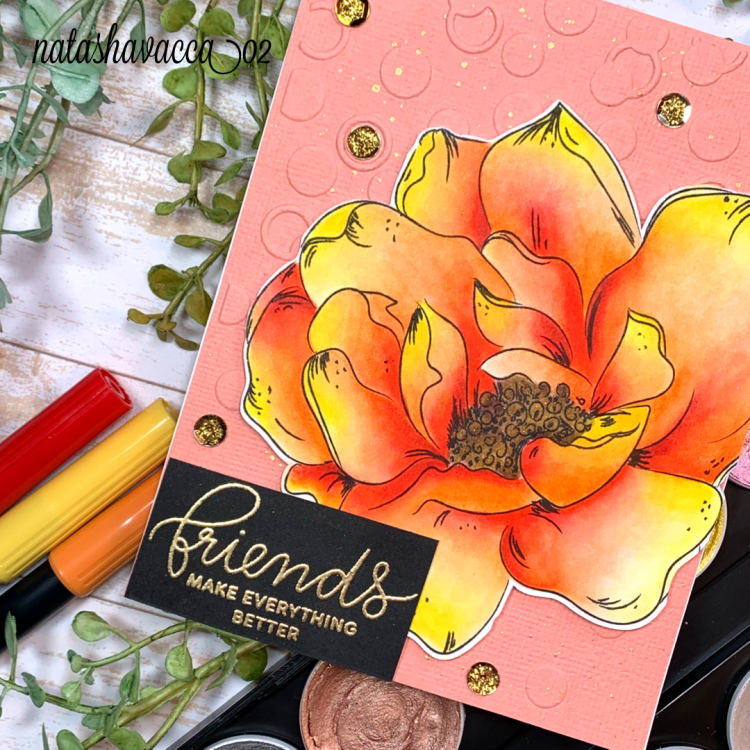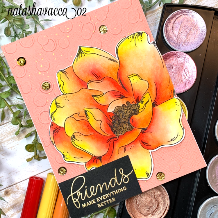 I then chose a piece of card stock and used an embossing folder on the background. I added a little splatter in gold as well. I then used foam tape to adhere the flower to the card base. For the sentiment I chose a friends sentiment from Pretty Pink Posh. I heat embossed this in gold and adhered it to my card. I then added a few gold sequins to the card base, as well as stickles in the center of the sequins.