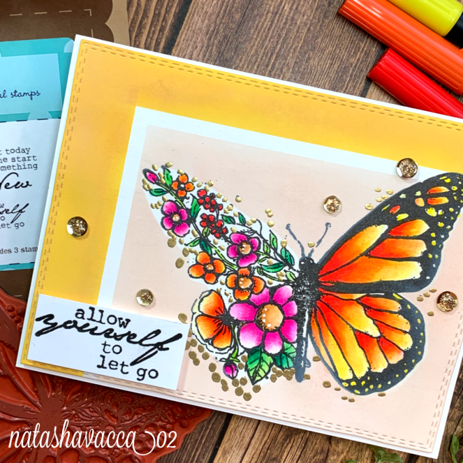 I chose a sentiment from the Allow Yourself stamp set… I loved this sentiment and it just reminded me that during these tough times there are some things I can’t control. I am trying to let go of the things I can’t control and take things day by day. I hope this butterfly brings you a bit of joy today! Wishing you and your family all the best and good health.