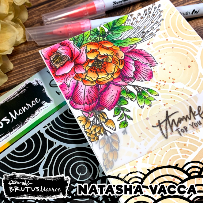 For today’s card I am using the stencil of the month, as well as the beautiful Love you Floral stamp set from Brutus Monroe. I love this stamp set! Check it out…. I used one corner of the stamp for this piece. I inked up one corner using Brutus Monroe Detail Raven ink. I love the crisp stamped image I get using this ink! I colored in my florals using my zig clean color brush markers. I then added details to the nooks and crannies using my Arteza colored pencils.