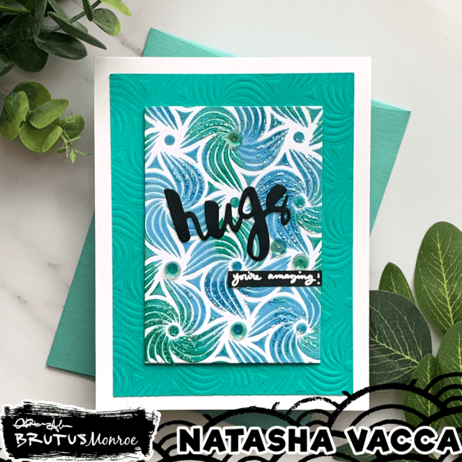 I started by preparing my stencil with adhesive spray. I have found the spray to work well with temporarily adhering the stencil to the paper. This is especially helpful when working with pastes! Once everything was set, I was ready to play with Velveteen glazes on my Stencil of the Month. Today I am using 2 Velveteen Glazes: Midnight Indigo and Fresh Kale. I enjoyed using these 2 colors together. I did lighten the Midnight Indigo a bit, with white Gesso, as I wanted a lighter blue. To do this I just mixed a little of each together on my glass mat (Gesso and Midnight Indigo) and it was ready to go. When I applied this glaze I wanted to create a mix of the 2 colors on the stencil. So I randomly applied the color. Once it was all set, I placed this panel aside to dry over night. I then prepped the teal color card stock panel by dry embossing the stencil using my die cutting machine. I also prepared 2 sentiments for my card. I chose a Hugs die cut from Simon Says Stamp and another from Super Sentimental Brutus Monroe. I die cut the Hugs sentiment 2x and adhered these together. I embossed the other sentiment on black card stock using white embossing powder.