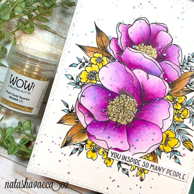I started by stamping 2 of the floral images from the set, as well as 3 of the leaves from the set on Canson Watercolor cardstock. I prepped the area first with my embossing buddy and then stamped the images using my Misti and clear embossing ink from WOW. When I use clear embossing ink I like to stamp the images at least 2x to ensure I get a good impression. I then used Gold embossing powder for my images and heat set them. Then I tapped them down onto my board so I was ready to watercolor.