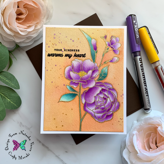 I started by stamping this gorgeous background on Canson water color card stock. I used WOW embossing ink and Brutus Monroe Gilded Gold embossing powder! I love the added touches of gold for a fall card! I spent a couple of evenings working on watercoloring this beautiful stamp and working in layers! I used my Mijello Mission Gold watercolors on this card! I love these colors and they truly blend beautifully, but are also very vibrant! Which I love! In my leaves I did add some gold water color from my Gansai Tambi colors. I love adding touches of gold to my leaves!