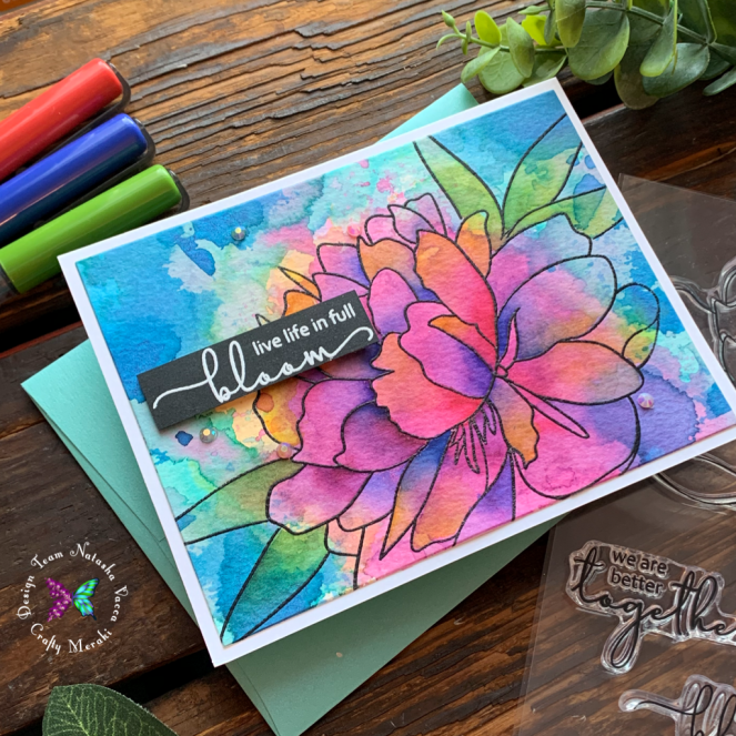 Happy Friday everyone! It has been a beautiful week here, lots of sunshine, gardening time, family boating, as well as crafting time! Today I am guest designing at Crafty Meraki. I was so excited to use the beautiful collaboration set from Hero Arts and Altenew – Bloom and Grow! This stamp is beautiful! Today I wanted to create a bold and colorful card using ink smooshing and markers! Let’s get started!