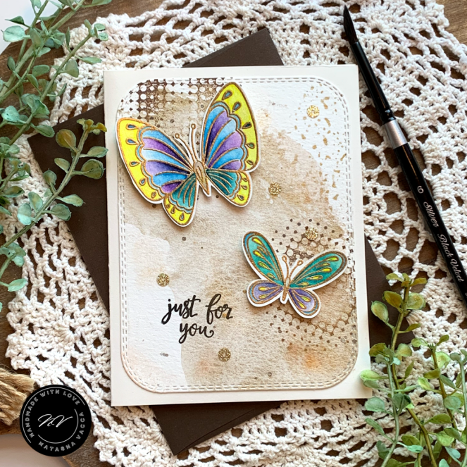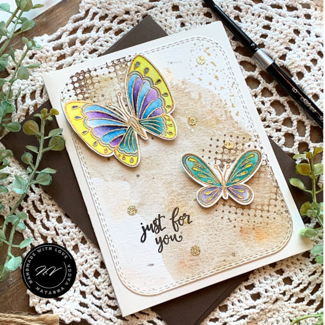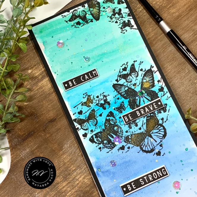 For my background today I am using one of the newer background stamps in the Unity collection, it is called Polka Dance! I just LOVE everything about this background stamp! Be sure to check it out now – it is on sale too! To create the background I trimmed a panel of watercolor cardstock to slimline size 3.5 x 8.5 and placed this in my Misti. I inked up the background using Distress Inks: Peacock Feathers, Shaded Lilac, Gold Pigment Ink, and my zig marker. I lightly misted the stamp with water and stamped the image. I completed this several times to ensure I had the colors I was looking for. I then trimmed down the panel using a Gina Marie Designs slimline die. I also added Perfect Pearls to some of the dots for added shine.